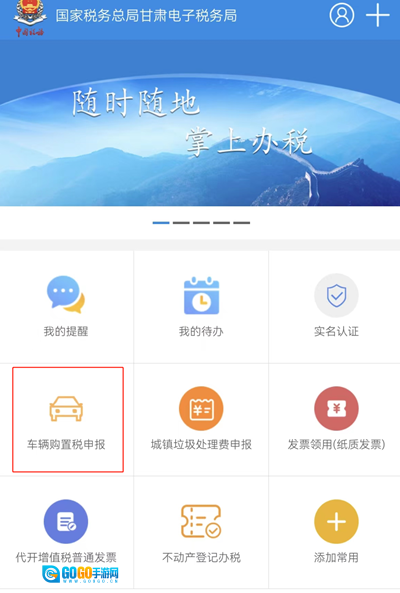 1、在陇税通端首页点击“车辆购置税申报”,进入申报表填写界面;重点关注:陇税通可免登录办理车辆购置税申报。