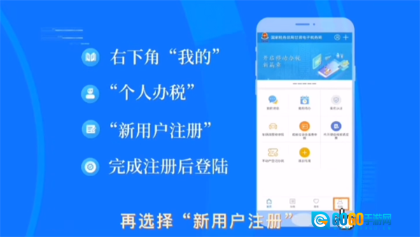 2、然后点击右下角的“我的”-“个人办税”-“新用户注册”-“完成注册后登陆”。