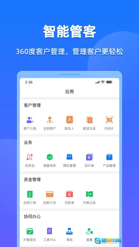 2、智能客户管理:通过360度全方位的客户管理模式,使客户管理工作变得更为便捷高效。