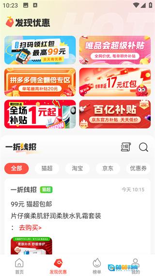 3、点击下方工具栏的“发现优惠”,里面有个一折线报,能帮你快速找到实惠的好东西。