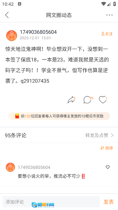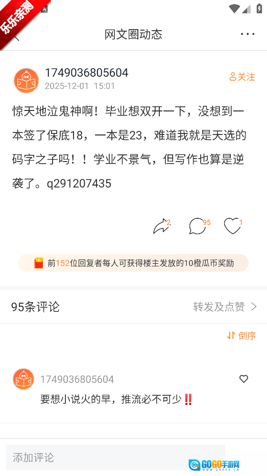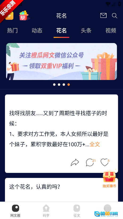 橙瓜是杭州道文网络科技有限公司打造的网络文学交流与创作平台,面向网络文学爱好者、作者及行业从业者。平台整合了码字工具、行业资讯、社交互动、小说阅读与数据查询功能,旨在构建一站式网络文学服务生态。用户借助橙瓜,既能高效进行创作、交流经验、了解行业动态,也能畅享涵盖玄幻、言情、都市、科幻等全品类的阅读资源;平台支持按分类、字数、状态筛选小说,还会依据用户喜好推荐“十年经典”“完结好书”等个性化书单,助力解决书荒问题。此外,橙瓜实时更新网文圈新闻、八卦及招聘求职信息,方便用户把握行业趋势;用户可创建或加入兴趣社团,与同好分享创作心得,建立深度交流联结。
