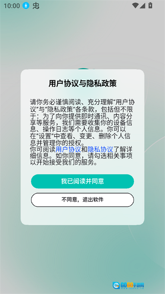 1、启动软件后,需仔细阅读对应的用户协议和隐私政策,随后点击同意并进入后续步骤。