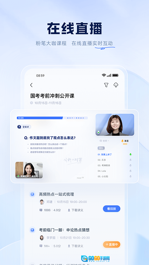 2、在线直播课:汇聚全国知名教师授课,可参与实时互动,体验真实课堂场景,课程支持无限次播放。
