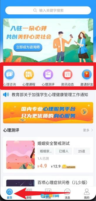 2、在首页页面,用户能够开展心理咨询、学习心理课程、完成心理测评以及邀请好友等操作,从而方便大家快速运用主要功能。
