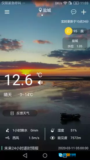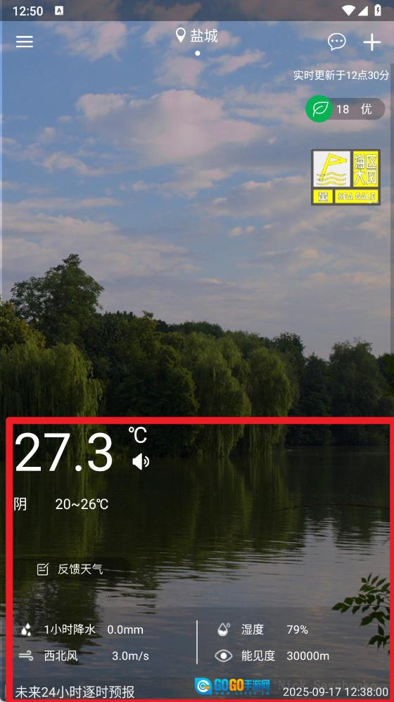 2、在首页界面,可以实时查看盐城市的天气情况,包括温度、风力、湿度、降水量及能见度等详细信息。