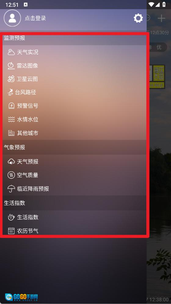 4、在左侧菜单栏,用户可选择天气实况、台风路径、水情水位等多种监测预报服务,全面掌握气象信息。