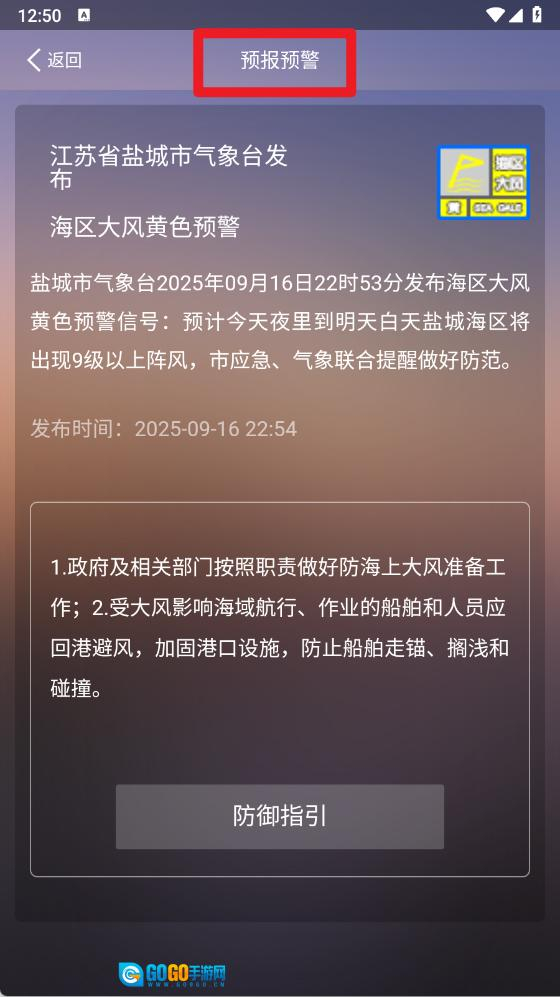 3、点击预报预警栏目,可以查看盐城市气象台发布的最新气象预警信息,帮助用户及时做好防范措施。