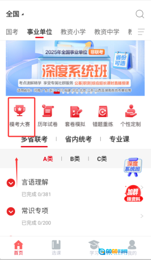 2、事业单位模考大赛模块提供全真模拟考试环境,帮助用户检测备考水平与实战能力。
