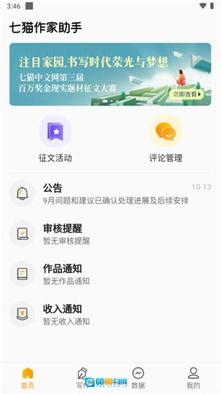 1、登录完成后,在首页可以看到征文活动、作品通知以及收入通知。