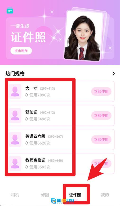 4、证件照页面提供一键生成服务,支持大一寸、驾驶证、四六级、教师资格证等多种规格。