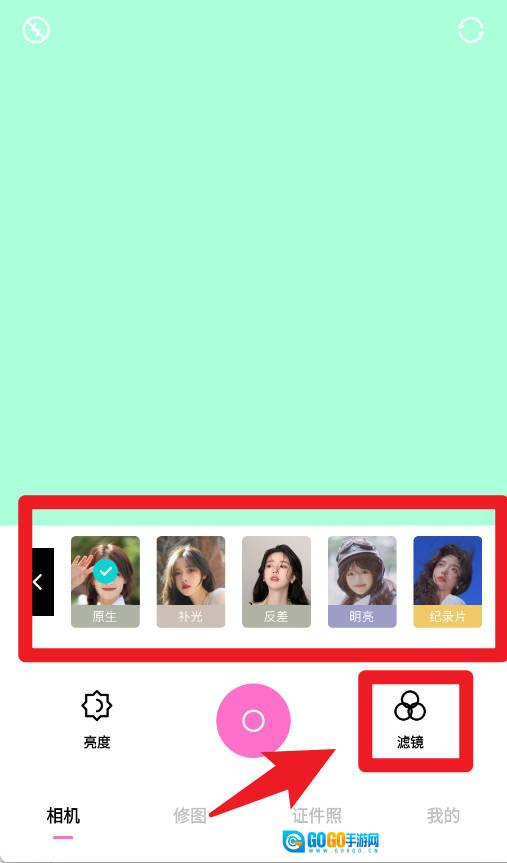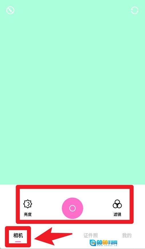 1、相机页面支持亮度调节与滤镜选择,点击中间按钮即可快速拍摄照片。
