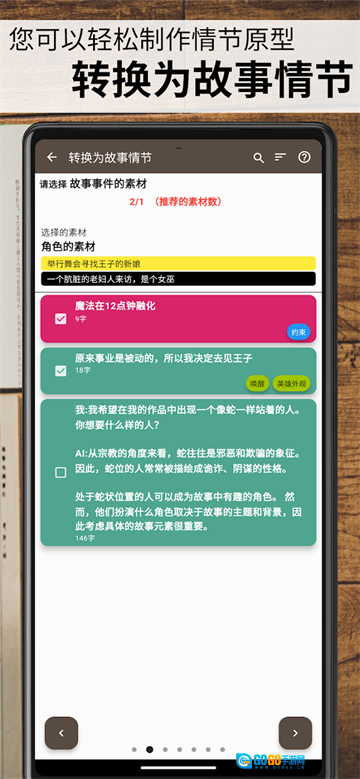 2、合理转化日常积累素材,辅助生成剧情,运用片段、整理提纲,助力写出有趣故事。