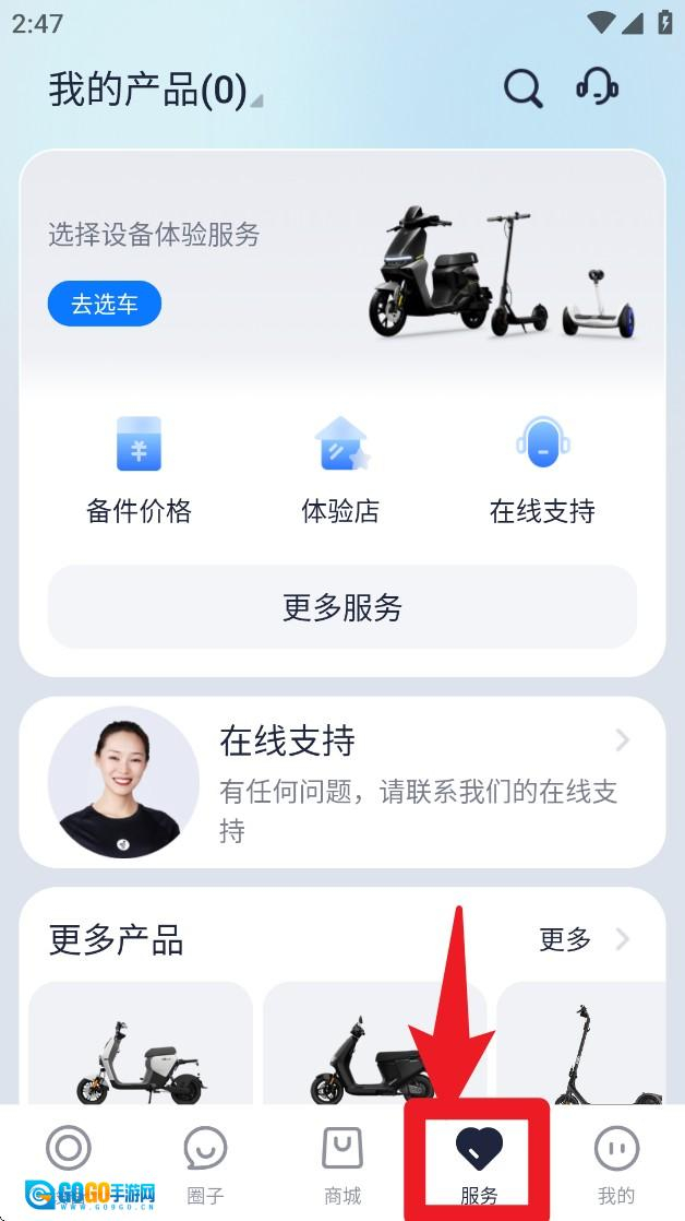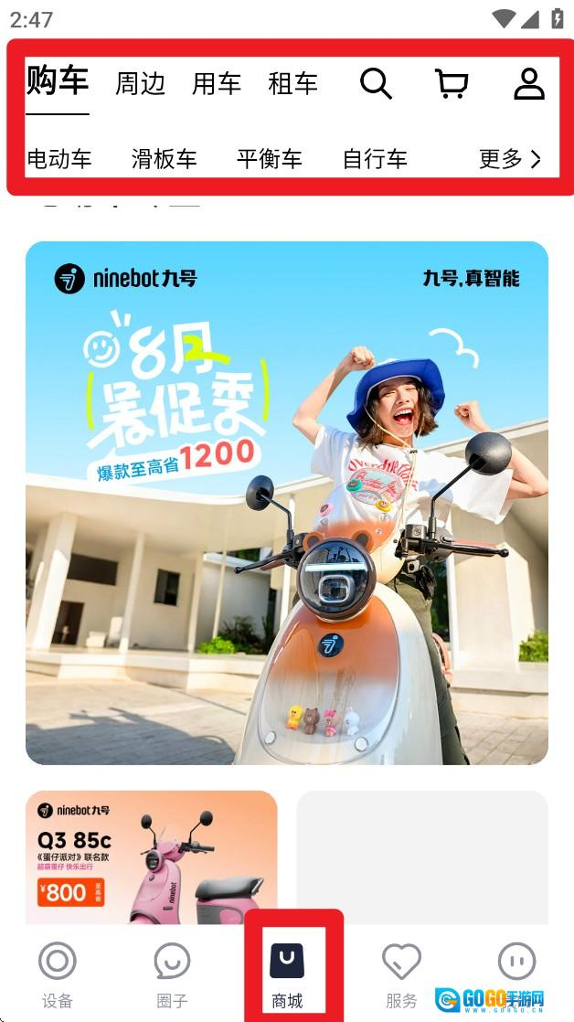 4. 进入商城页面可查看电动车、滑板车、自行车等商品分类,同时支持跳转查看促销活动与周边购买服务。