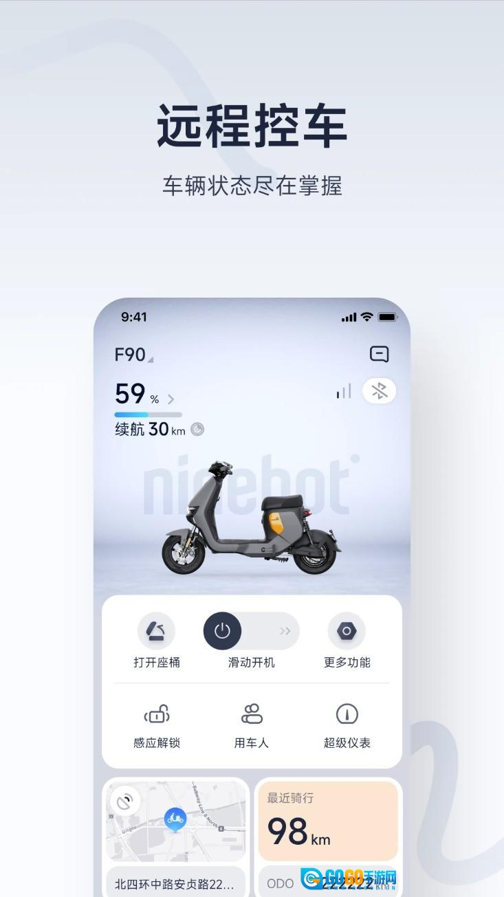1、智能设备管控:支持通过蓝牙或远程方式操控九号系列设备,实现解锁、锁车、启动、设防等一键管理操作。