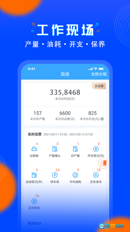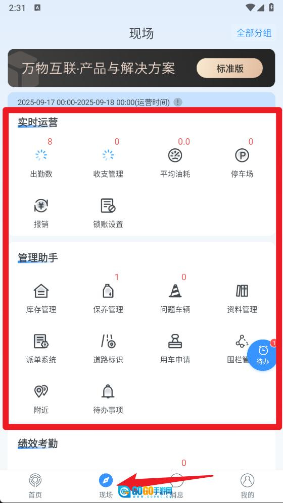 4、进入现场页面后,能够查看出勤数等实时运营数据,还可借助管理助手开展库存、保养申请等相关操作。