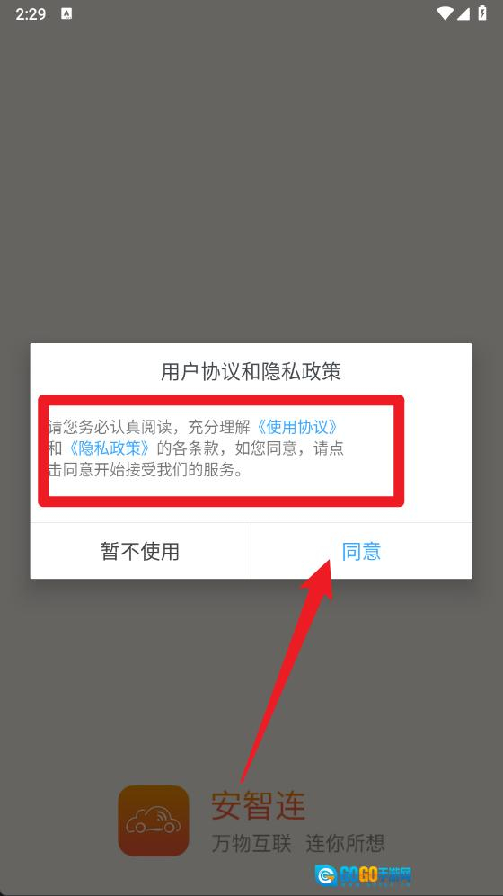 1、首次打开安智连应用时,系统会弹出《用户协议》提示框,用户需要仔细阅读协议内容,点击同意按钮后才能继续使用应用功能。