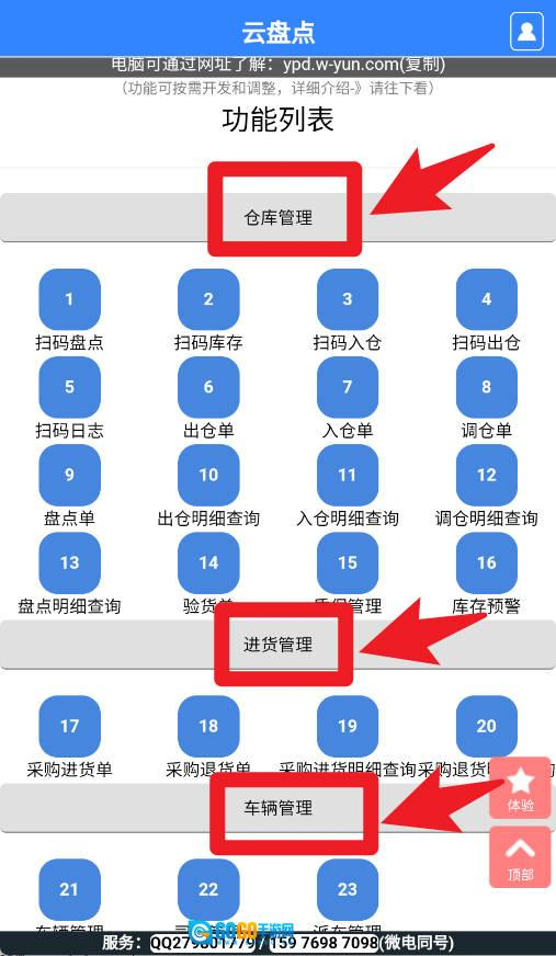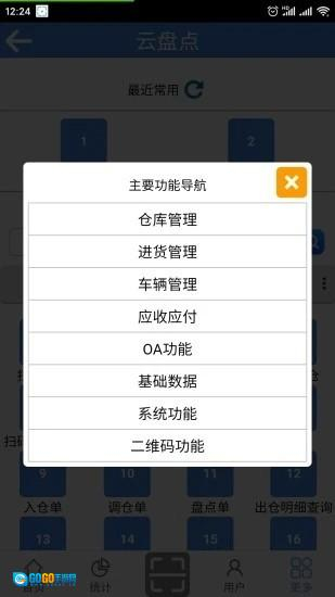 3、功能列表包含仓库管理、进货管理、车辆管理等模块,点击对应模块就能开展扫码盘点、出入库单管理以及库存查询操作。