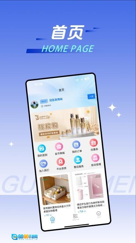 2、首页设有签到积分、金币商城以及订单管理等功能板块,为会员提供相关权益与服务。