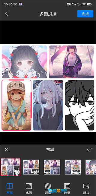 3、多图拼接:支持选取多张图片进行拼接,并且可以对布局、比例、背景等参数进行调整