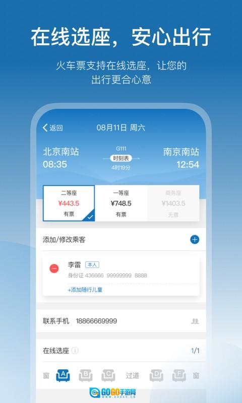 3、进入火车票购买页面后,您可以选择一等座或二等座,填写联系电话,完成在线选座操作。