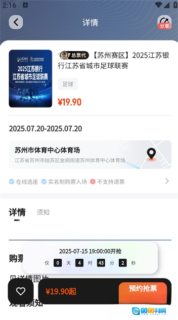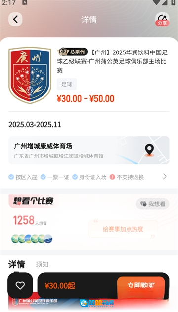 《看个比赛》作为体育领域颇具影响力的移动互联网体育现场消费平台,致力于为球迷提供便捷的赛事购票服务。其业务范围广泛,涵盖国内外各类体育活动,涉及数字化票务、体育培训等四大细分领域。球迷可通过该平台获取丰富多样的赛事信息,并直接完成购票,亲身前往赛场为支持的球队加油助威。