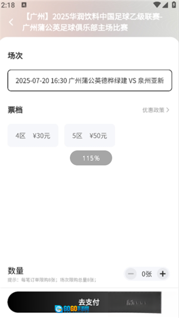 5.在此处选定观赛区域与购票数量,确认选择无误后点击支付按钮即可完成操作。