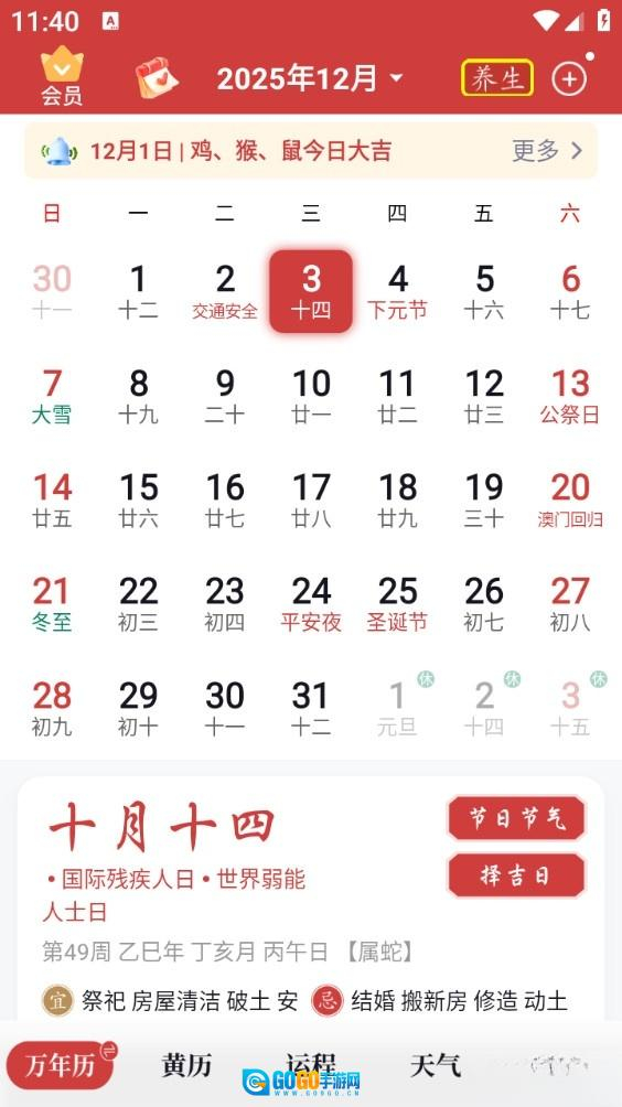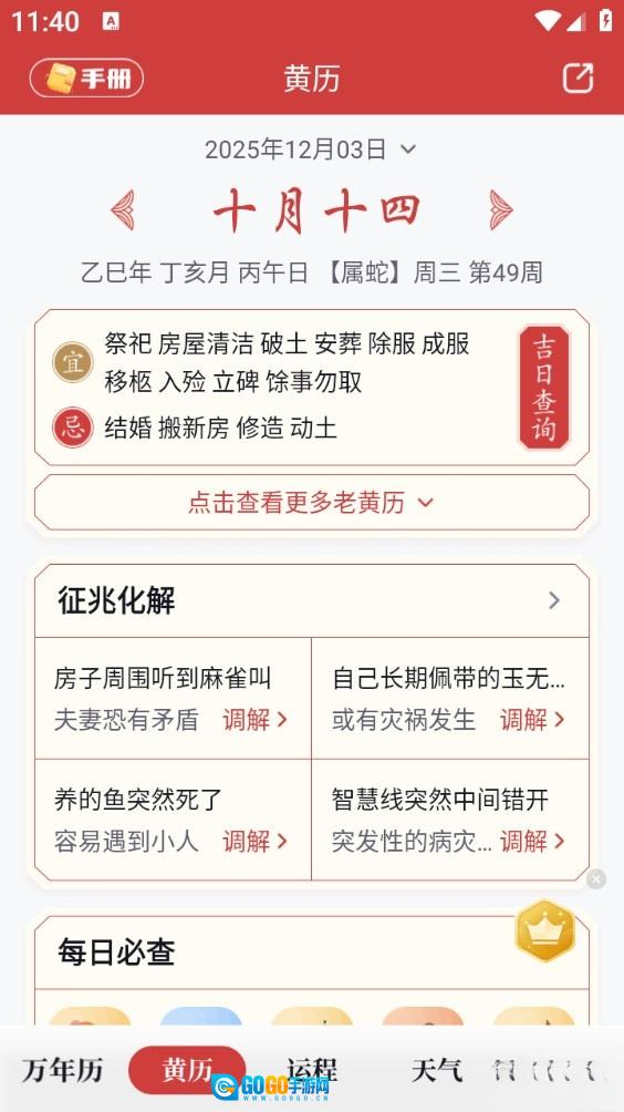 全民万年历是一款兼具实用性与美观性的日历应用,致力于为用户提供便捷的生活信息查询与管理服务。它将公历、农历、黄历与天气查询功能巧妙融合,使中华传统文化在现代科技的助力下焕发出新的生机。无论是日常的生活规划,还是出行时的气象需求,都能清晰呈现,让用户从容应对。这款手机应用凭借精致的国风设计和丰富多样的功能,成为用户贴心的生活助手。用户可以通过该软件查看最新的黄道吉日以及节假日的放假安排等信息。此外,二十四节气、实时天气等实用功能,方便用户快速查询日历信息并添加日程记事。