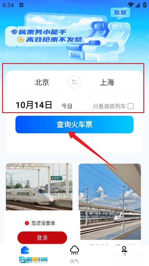 3、可以手动输入地点,也能点击下拉菜单选择之前查询过的地点,然后点击【查询火车票】按钮进行查询。