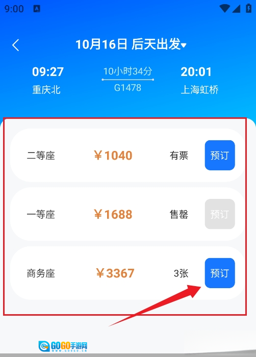 6、按照自身需求挑选座位等级,接着点击右侧的【预订】按钮,以开展后续的订票服务。