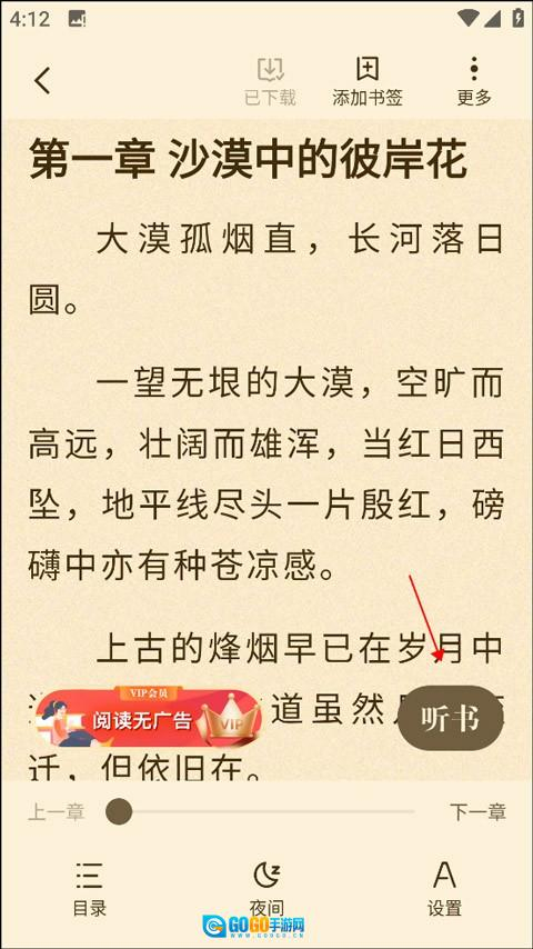 1、随意挑选一部小说,进入阅读界面后,点击右下角的【听书】按钮。