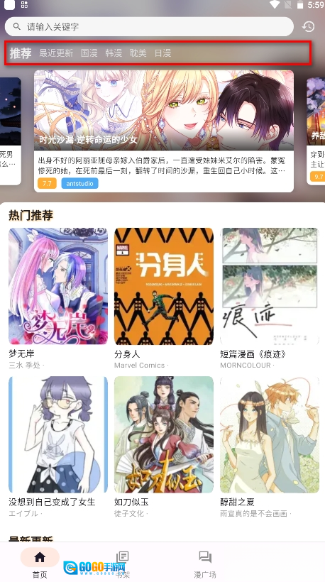 1.打开喵呜漫画,首页上方会呈现出最新的国漫、韩漫、日漫等板块内容。
