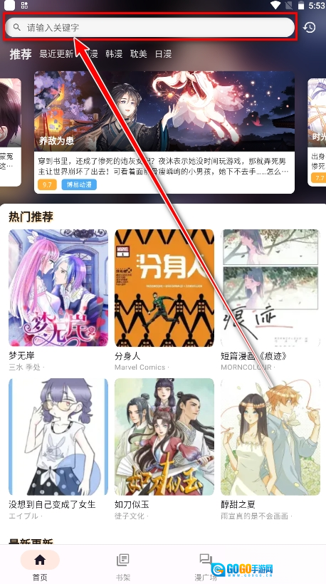 1.打开喵呜漫画,点击首页上方的搜索框。