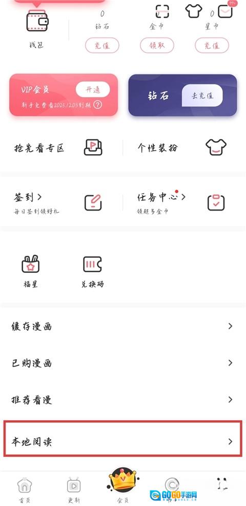 1、先将漫画文件保存到手机内(支持文件夹、zip文件、rar文件、7z文件),然后打开看漫画,点击【本地阅读】。