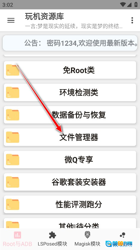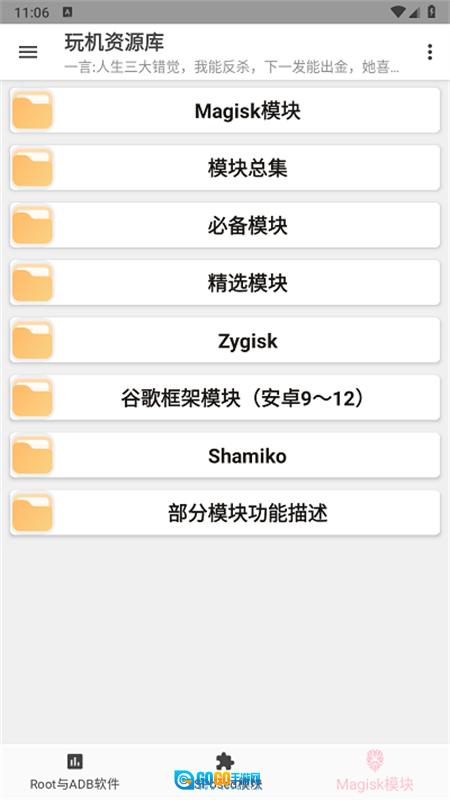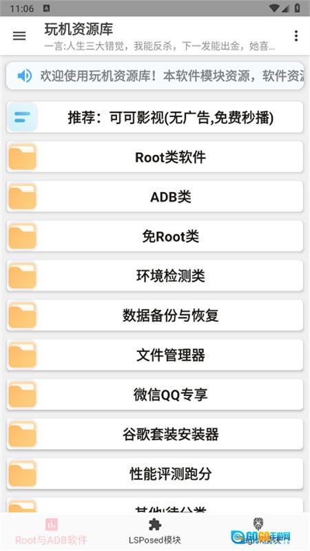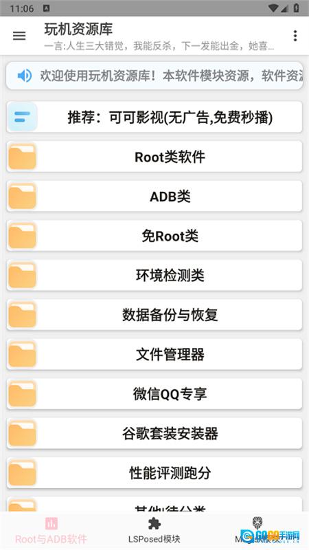 1.打开玩机资源库,可以看到第一板块是Root和ADB,主要的内容有环境检测类、数据备份与恢复、文件管理器等。