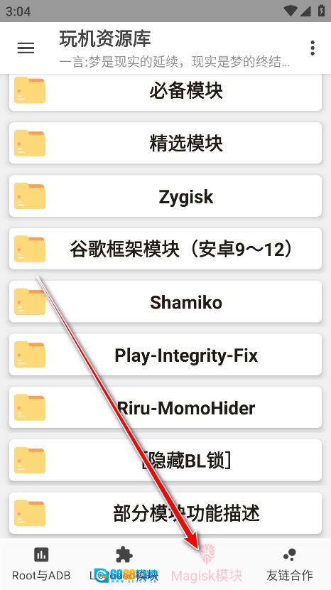 6.点击下方的Magisk板块,可以看到这里有着必备模块、精选模块、谷歌框架模块等内容,大家想用哪个就直接点击进入然后找到自己想要的资源即可。