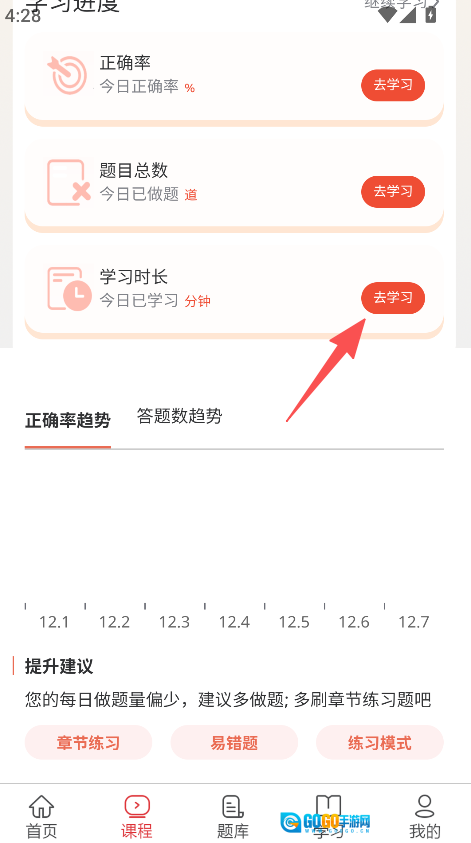 2、支持查看学习进度,涵盖正确率、题目总数、学习时长等信息,点击相应区域就能开启对应的学习内容。