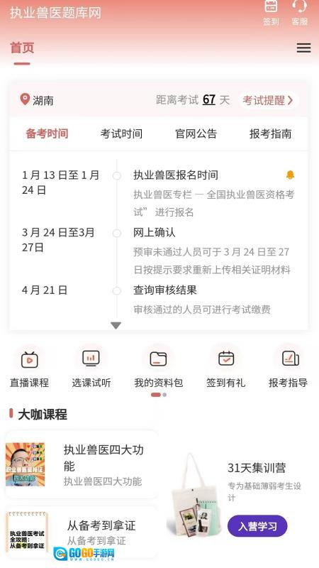 《执业兽医题库网》这款软件专为执业兽医备考群体打造。它配备打卡功能,既能记录用户的连续打卡状态,也能清晰展示当月打卡详情,帮助考生逐步养成规律的备考习惯。软件内设有学习进度模块,直观呈现答题正确率、累计题目总数以及学习时长等关键数据,点击相应区域即可直接进入学习页面开始练习。此外,平台还提供课程与题库两大核心板块,其中题库涵盖AI智能练习、分章节专项练习、高频易错题汇总、精简题集、考试相关资讯以及考前重点预测题等丰富内容;题目按章节分类设置,覆盖动物解剖学组织学及胚胎学、动物生理学等多个专业学科,全方位助力考生开展高效备考训练。