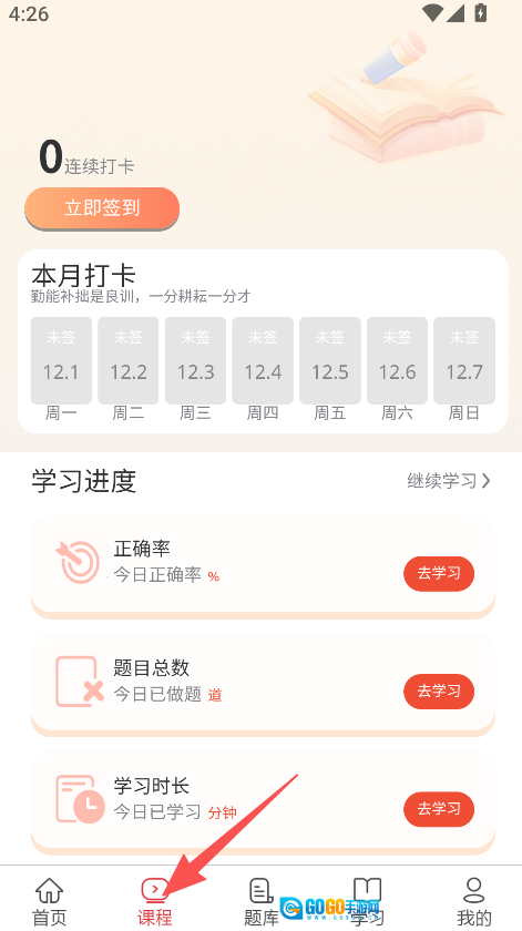1、启动软件后,点击底部的课程板块,接着在学习进度区域找到对应项,点击其旁边的“去学习”按钮。