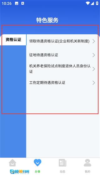 进入特色服务页面后,点击【资格认证】选项,就能看到各类待遇资格认证的分类,选择对应的项目即可办理。