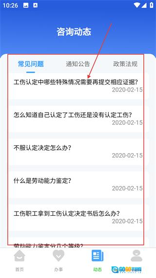 3、切换至【动态】页面,点击【常见问题】标签,即可查看工伤相关等各类咨询内容,了解办事指引。