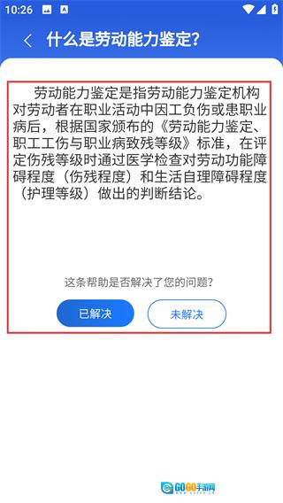 4、点击具体问题(如“什么是劳动能力鉴定”),就能查看详细说明;看完之后,还可以反馈该帮助是否解决了你的问题哦。