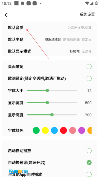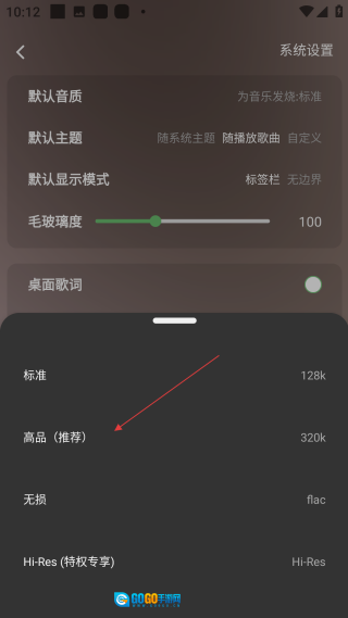 3、进入系统设置界面后,找到【默认音质】这一选项并点击它,此时会弹出一个包含多种音质类型的选择弹窗。