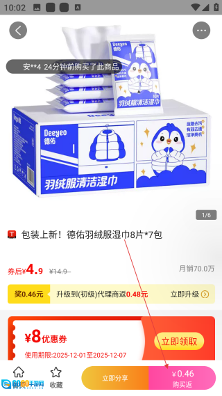 4、在商品详情页面,点击【立即领取】按钮,就能完成下单并获取返利。