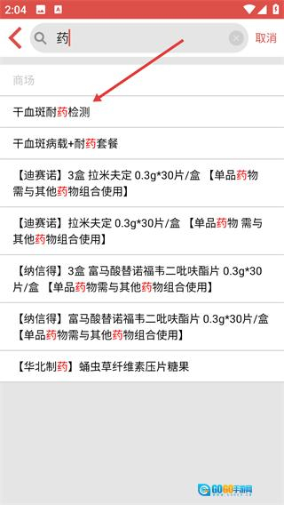 2、在搜索框中输入“药”字,系统会触发药品相关内容的搜索,这样就能找到所需的药物信息以及检测服务,为后续操作提供便利。