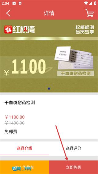 4、进入【干血斑耐药检测】详情页面,确认价格为【¥1100】后,点击【立即购买】按钮即可完成该检测服务的选购流程。