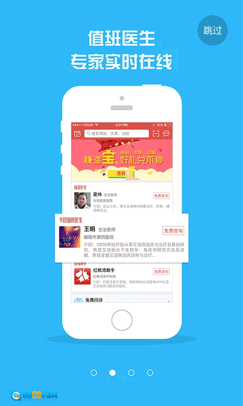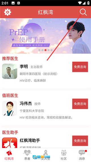 1、主界面设有推荐医生列表,点击【免费咨询】按钮,即可与【李明】等医生进行在线交流,从而快速获取HIV诊疗方面的专业建议。