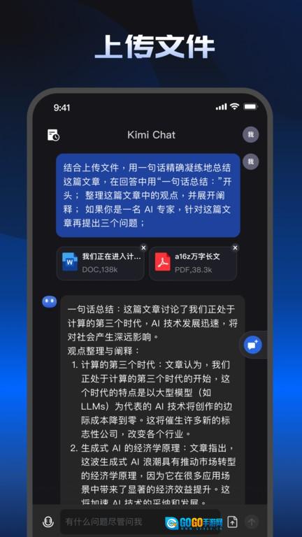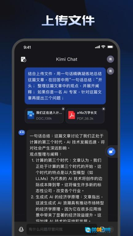 2. 文件阅读理解:用户可以上传TXT、PDF、Word、PPT、Excel等多种格式的文件。Kimi可以阅读和理解文件内容,然后提供相关的响应和信息。