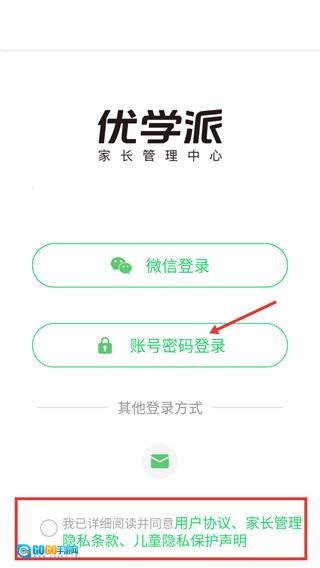 1、在【优学派-家长管理中心】登录页面,勾选对应的相关协议后,点击【账号密码登录】这一选项,即可进入到账号密码的填写界面。