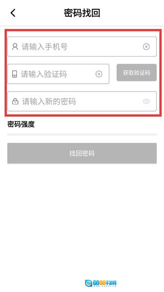 3、进入密码找回页面后,按顺序找到【请输入手机号】【请输入验证码】【请输入新的密码】这几个输入框,为填写信息做好准备。