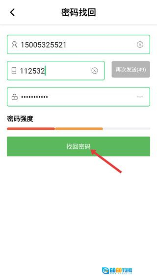 4、填写手机号、收到的验证码以及新密码后,点击绿色的【找回密码】按钮,即可完成密码重置操作。